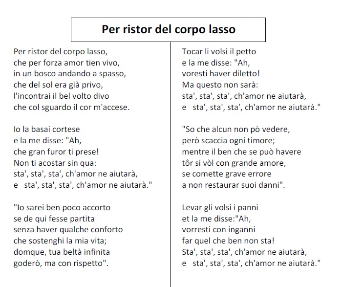 [1] Costantino Nigra (1828-1907), uomo politico piemontese, ma anche filologo e poeta. Si dedicò alla raccolta dei canti popolari della sua regione e sull'argomento pubblicò "Canti popolari del Piemonte" (1888) [2] O Gigiota, bela Gigiota, / una licenza vuria da te, / una licenza date vuria, / solo una notte a dormire con te. Mezzanotte, un bussetto alla porta, / cara Gigiota venite ad aprir, / con una mano apri la porta / e con quell'altra accarezza il tuo amor. O Gigiota, bela Gigiota, / chi è quell'uomo che è a letto con te? / L'è mia sorela, Caterinela, / che l'è venuta a dormire con me. [3] "O Pinota" raccolta nel 1938 a Pian di Macia (BO) ed armonizzata da Giorgio Vacchi [4] "E picchia, picchia a la porticella" (Valsugana) - Ricostruzione di Luigi Pigarelli. [5] La Valle Cannobina è una valle del Piemonte, in provincia del Verbano Cusio Ossola. Prende il nome da Cannobio (sul Lago Maggiore), il principale abitato che si trova al suo inizio. [6] Armando Corso - vedi http://www.corocauriol.com /armando.html [7] "Apografo miscellaneo marciano" - Francesco Luisi - Edizioni Fondazione Levi - Venezia 1979 (Edizione critica integrale dei Manoscritti Marciani, 1795.1798). "Apografo" = copia del manoscritto originale